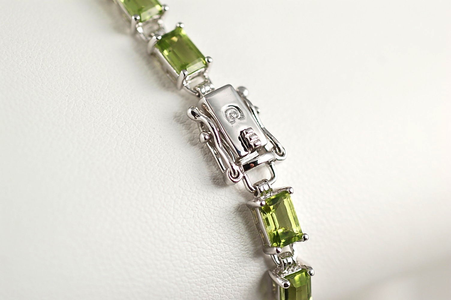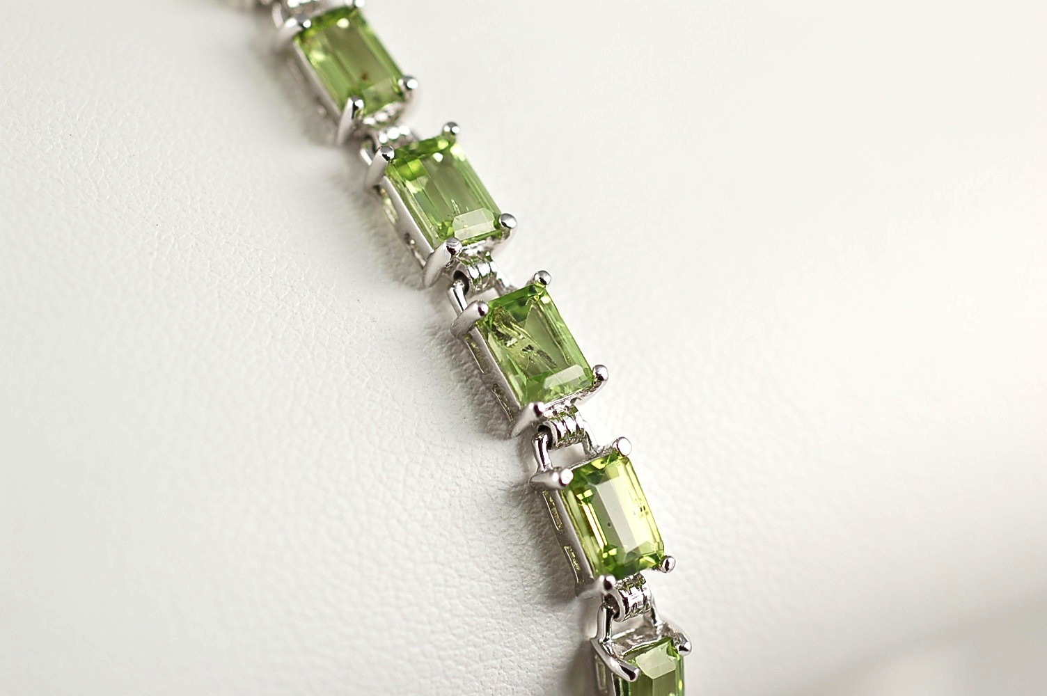 Sparkle on with this Made in Italy Solid 925 Sterling Silver (Rhodium Coated) Natural Gemstone Bracelet! Be seen with 23.4 Emeraild cut prong set Natural Peridot all the way around the wrist for a total weight of 23.4 Carats. This Sparkling bracelet measures 7 inches long, weighs a total of 13.8 grams and closes with a secure slip in clasp.