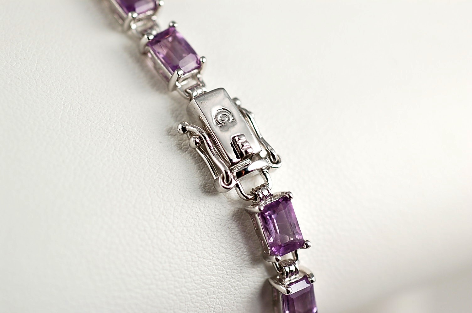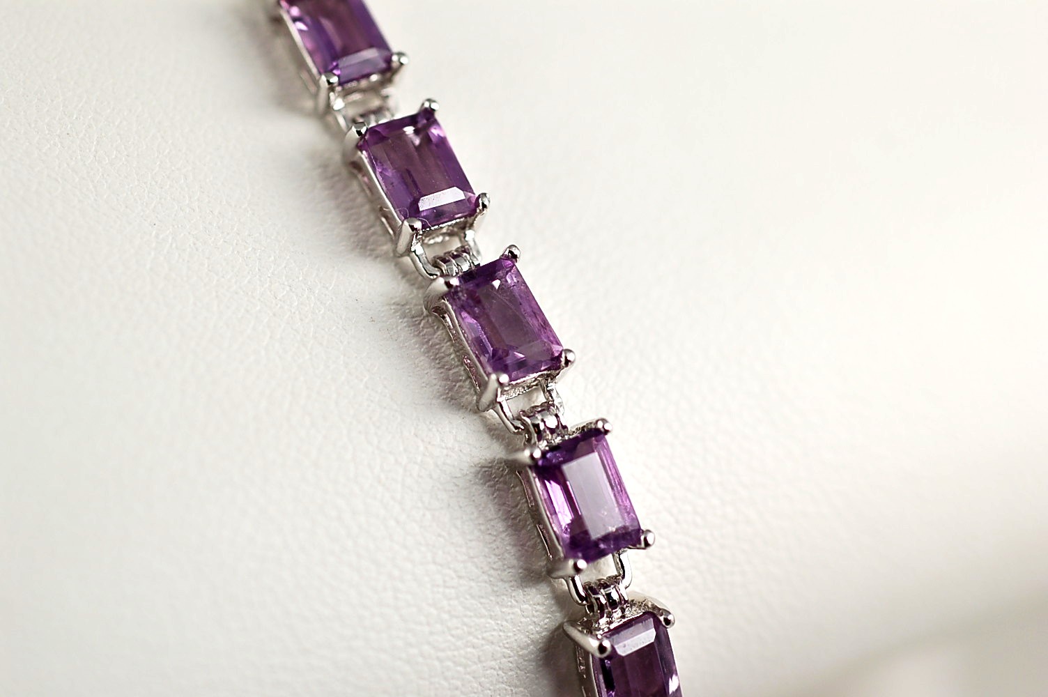 Sparkle on with this Made in Italy Solid 925 Sterling Silver (Rhodium Coated) Natural Gemstone Bracelet! Be seen with 23.4 Emeraild cut prong set Natural Amethyst all the way around the wrist for a total weight of 23.4 Carats. This Sparkling bracelet measures 7 inches long, weighs a total of 13.8 grams and closes with a secure slip in clasp.
