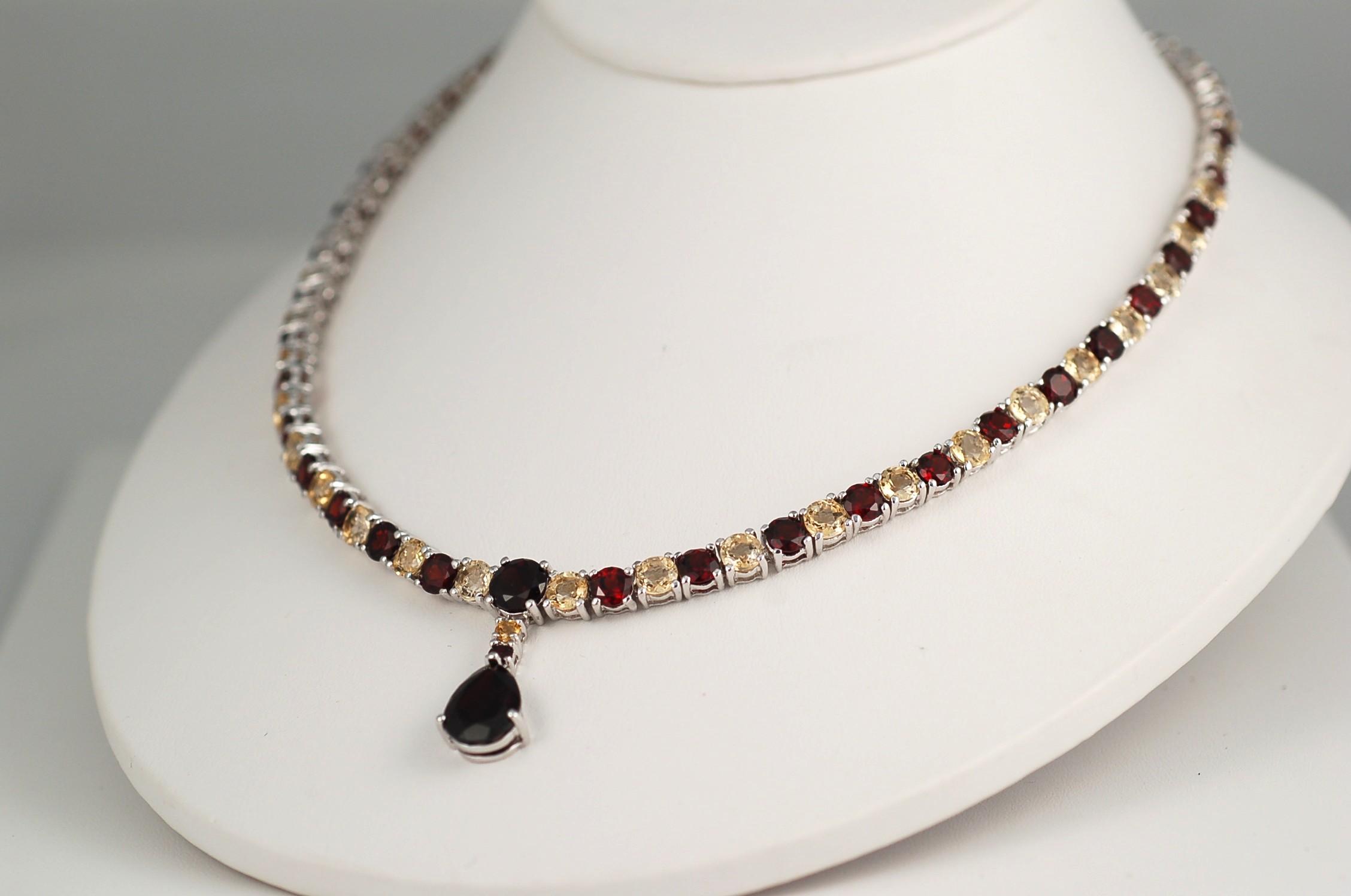 This Made in Italy Gorgeous Eye-Catcher necklace will become an instant Favorite! This Beautiful necklace with a Huge 5 carats Garnet Drop Pendant well made in Solid 925 Sterling Silver (Rhodium Coated) and features 40.00 carats round cut Genuine Garnet and Citrine. This Beautiful necklace measures 18 inches long, secured by tongue and groove with figure 8 and weighs 46.5 grams. Exquisite design with Italian Craftsmanship!