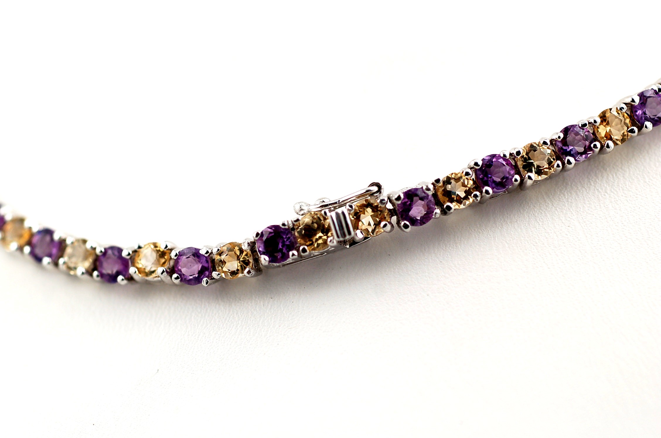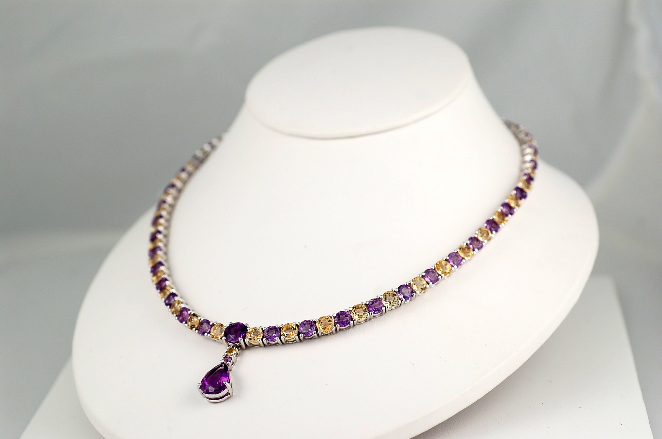 This Made in Italy Gorgeous Eye-Catcher necklace will become an instant Favorite! This Beautiful necklace with a Huge 5 carats Amethyst Drop Pendant well made in Solid 925 Sterling Silver (Rhodium Coated) and features 40.00 carats round cut Genuine Citrine and Amethyst. This Beautiful necklace measures 18 inches long, secured by tongue and groove with figure 8 and weighs 46.5 grams. Exquisite design with Italian Craftsmanship!