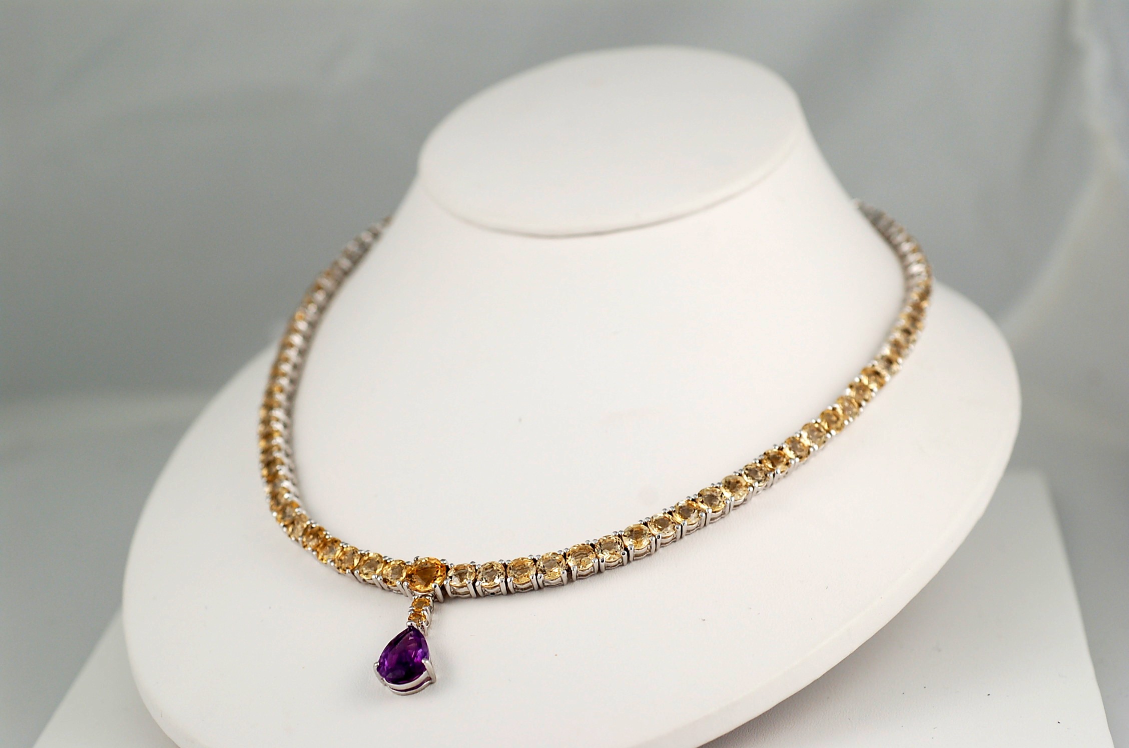 This Made in Italy Gorgeous Eye-Catcher necklace will become an instant Favorite! This Beautiful necklace with a Huge 5 carats Amethyst Drop Pendant well made in Solid 925 Sterling Silver (Rhodium Coated) and features 40.00 carats round cut Genuine Citrine. This Beautiful necklace measures 18 inches long, secured by tongue and groove with figure 8 and weighs 46.5 grams. Exquisite design with Italian Craftsmanship!