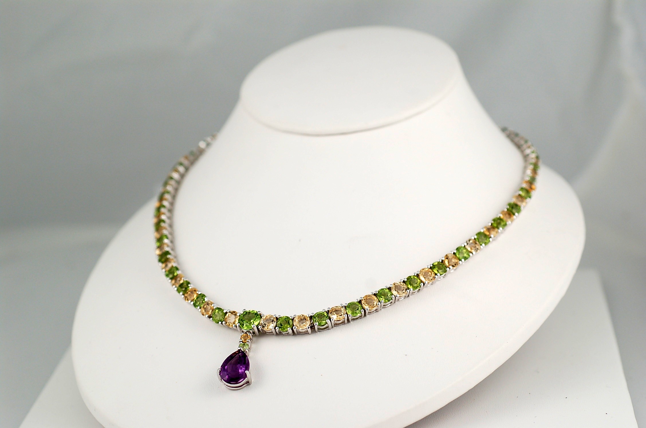 This Made in Italy Gorgeous Eye-Catcher necklace will become an instant Favorite! This Beautiful necklace with a Huge 5 carats Amethyst Drop Pendant well made in Solid 925 Sterling Silver (Rhodium Coated) and features 40.00 carats round cut Genuine Peridot and Citrine. This Beautiful necklace measures 18 inches long, secured by tongue and groove with figure 8 and weighs 46.5 grams. Exquisite design with Italian Craftsmanship!